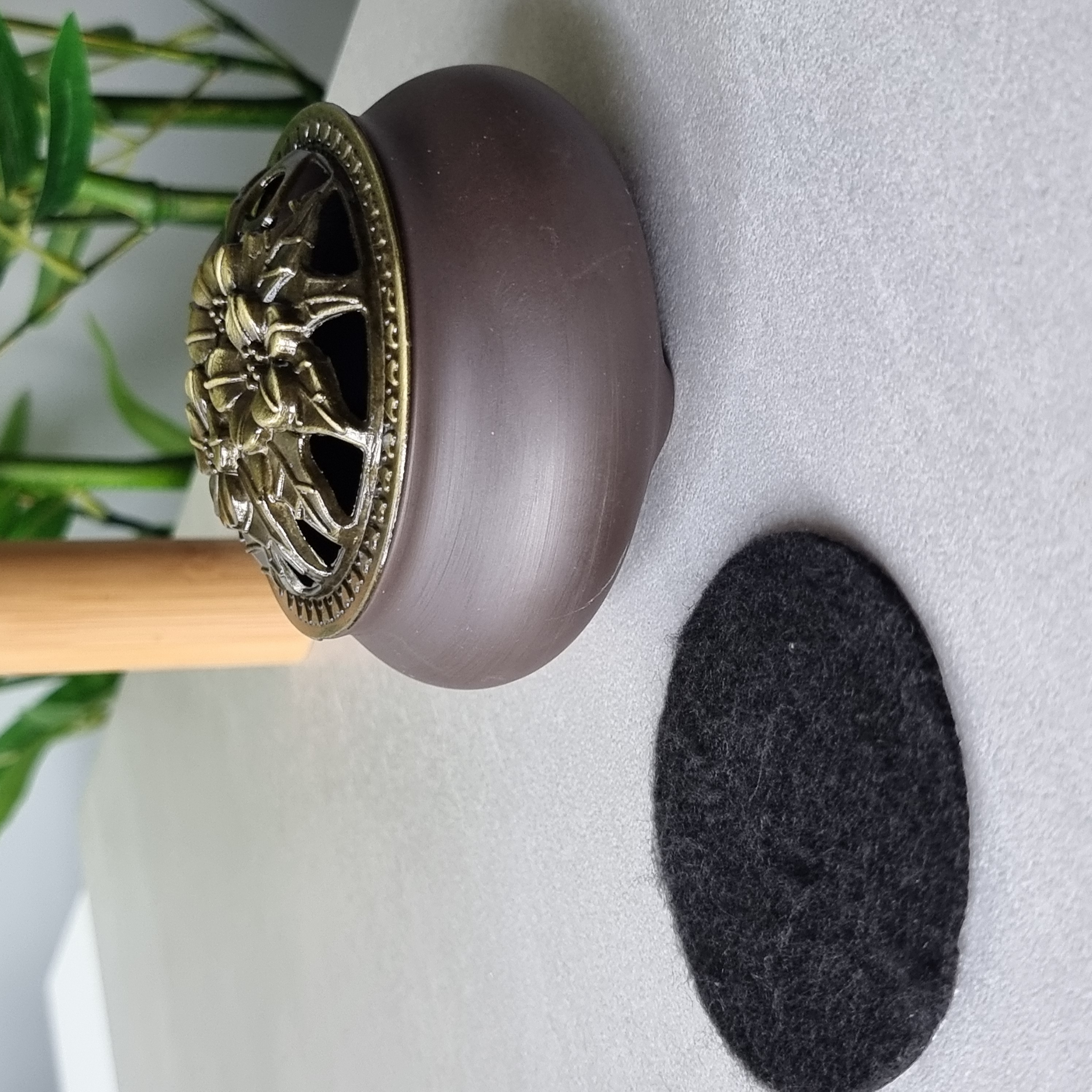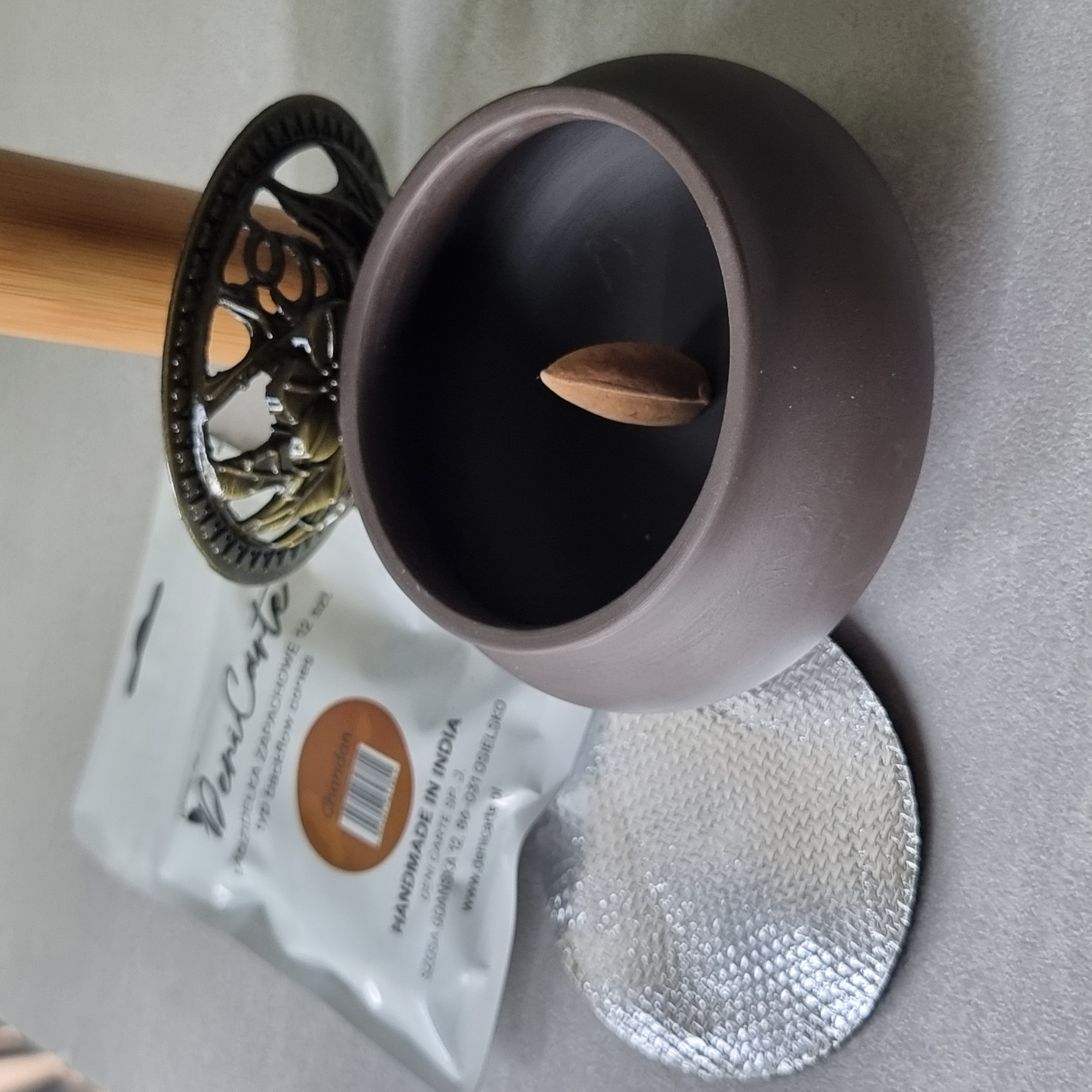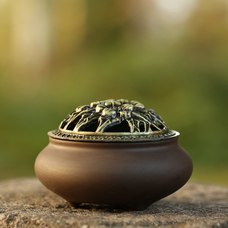 - wykonana z wysokiej jakości ceramiki, w kolorze brązowym z pokrywką wykonaną z metalu która ozdobiona jest pięknym ażurowym wzorem, która zapewnia optymalne warunki do równomiernego spalania kadzidła i rozprowadzania zapachu,