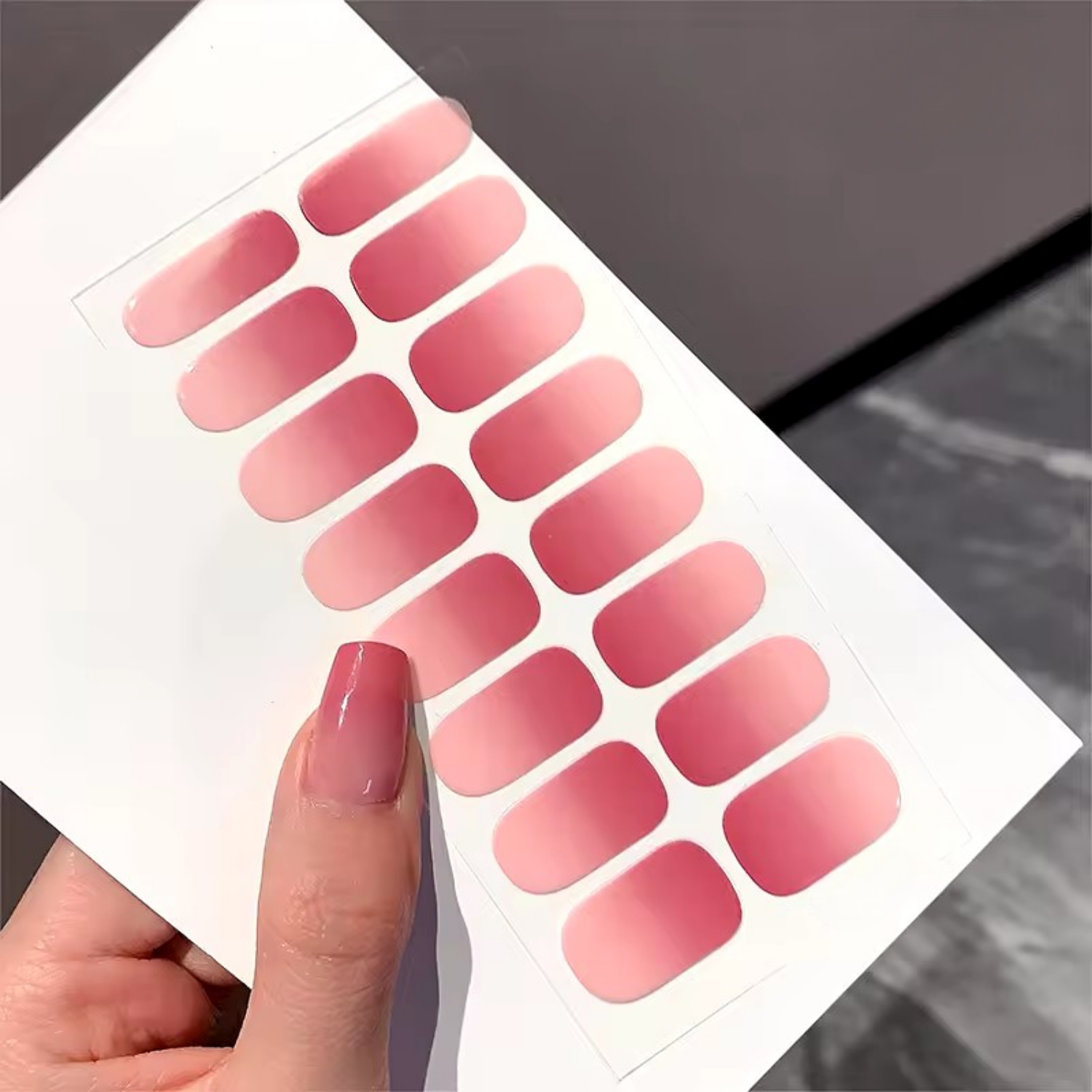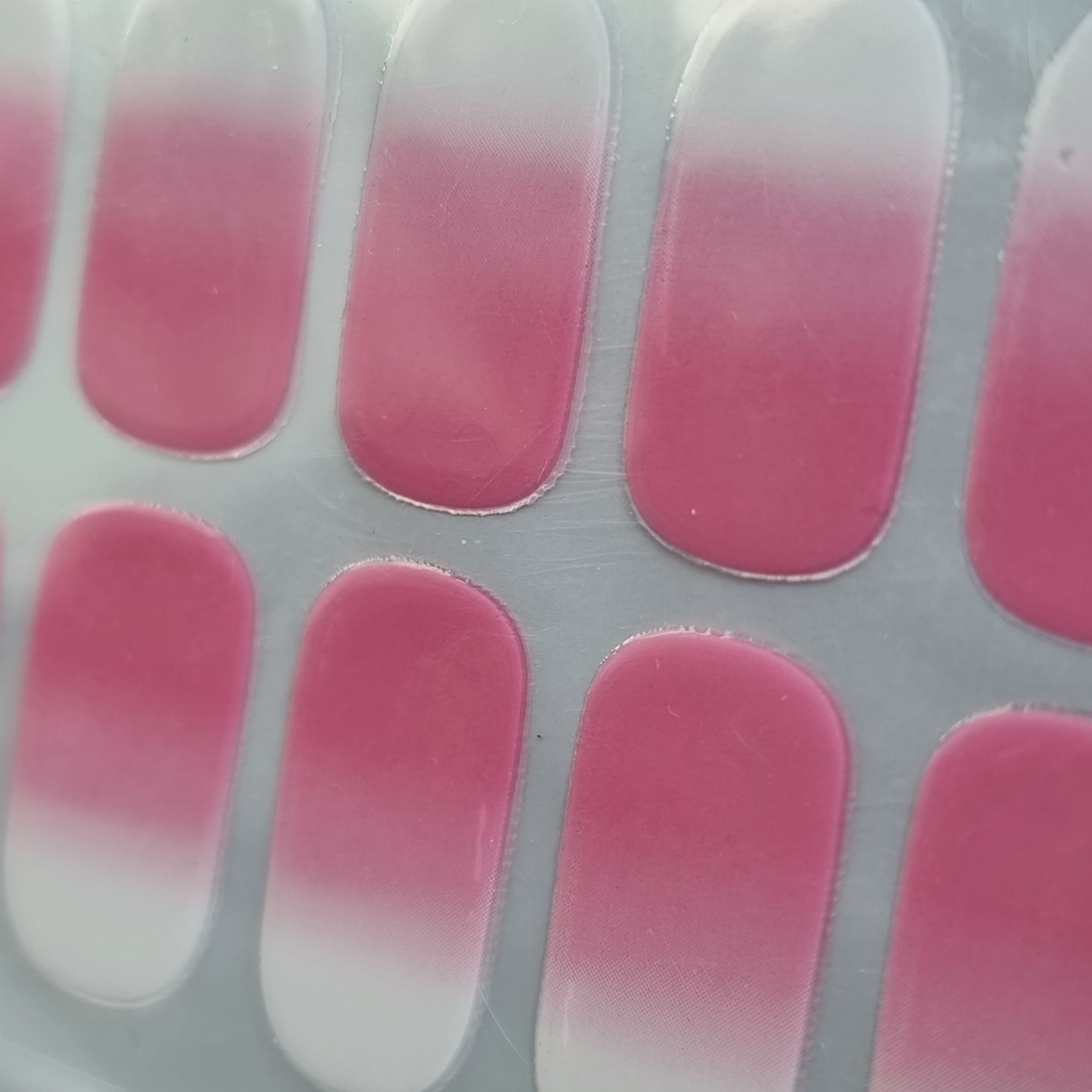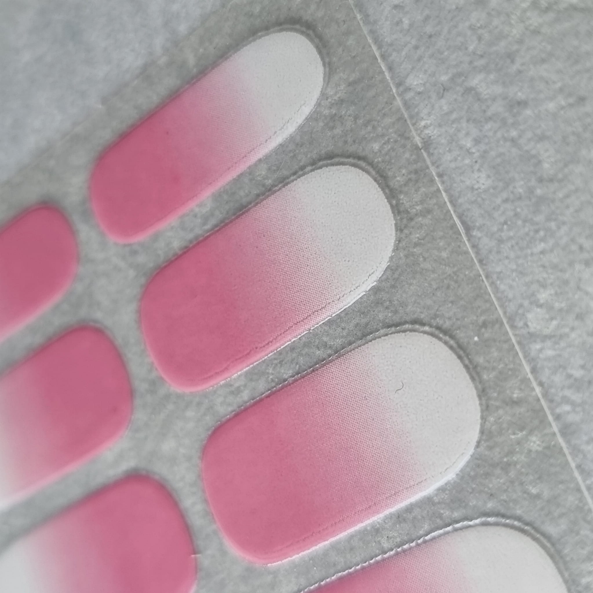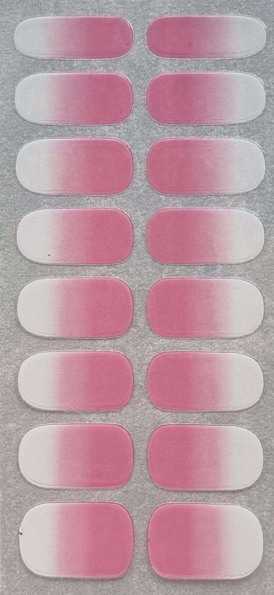 ✔️ Naklejki na paznokcie wyróżniają się subtelnym efektem ombre, który płynnie przechodzi od intensywnego, głębokiego różu do delikatnej bieli.
