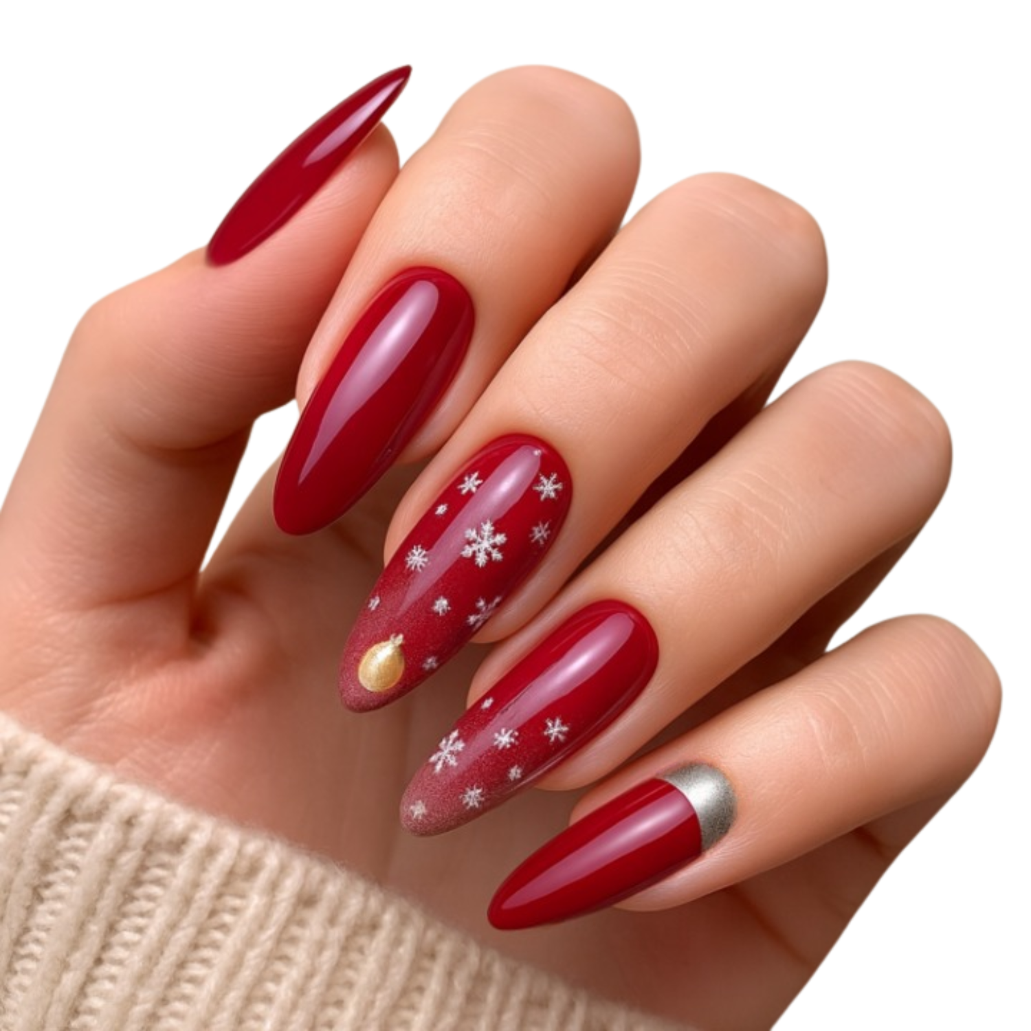 ✔️ Tipsy gotowe, paznokcie almond. Naklejane sztuczne paznokcie żelowe kolorowe. Tipsy w kolorze czerwonym ze świątecznym zdobieniem.